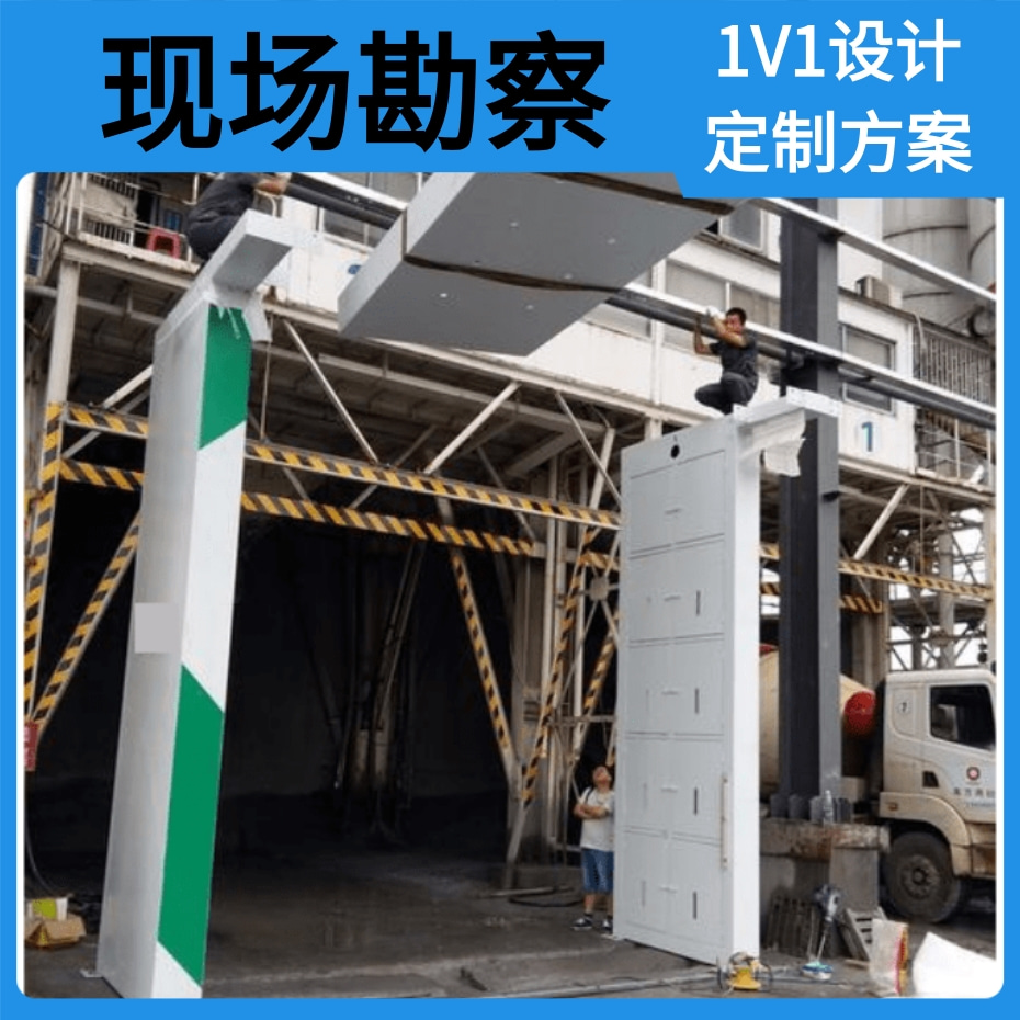 龙门式卸料口洗车机采用龙门式结构,安装在搅拌站下料口门口,不需要占用搅拌站额外场地,该系统侧面采用摇摆式水刀结构,能够进行全车冲洗,卸料口洗车机顶部设有顶喷,地面设有底盘冲洗,对于搅拌车的料斗设有下料斗冲洗,整个过程采用全自动控制,操作简单方便,功能显著